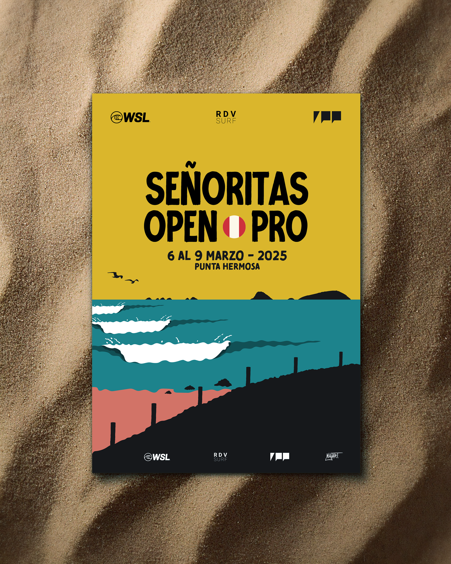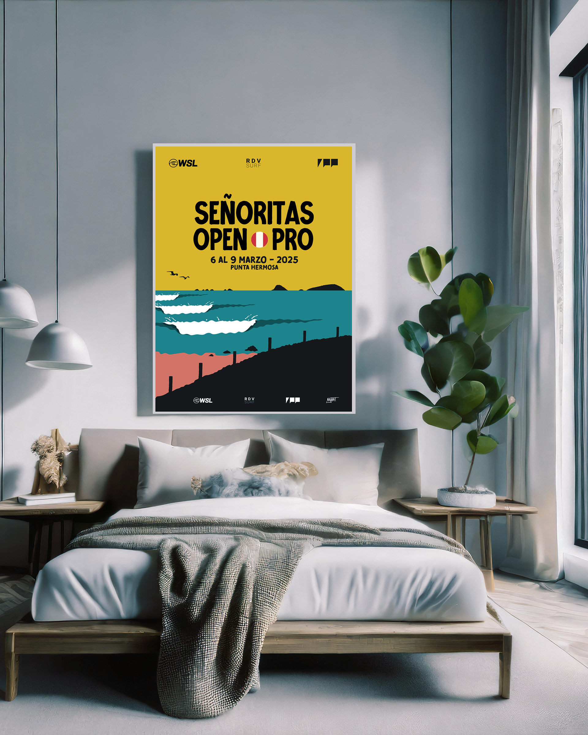Diseño de afiche y piezas gráficas para el Señoritas Open Pro 2025, Torneo internacional de surf de la WSL que se llevó a cabo en Punta Hermosa - Perú.